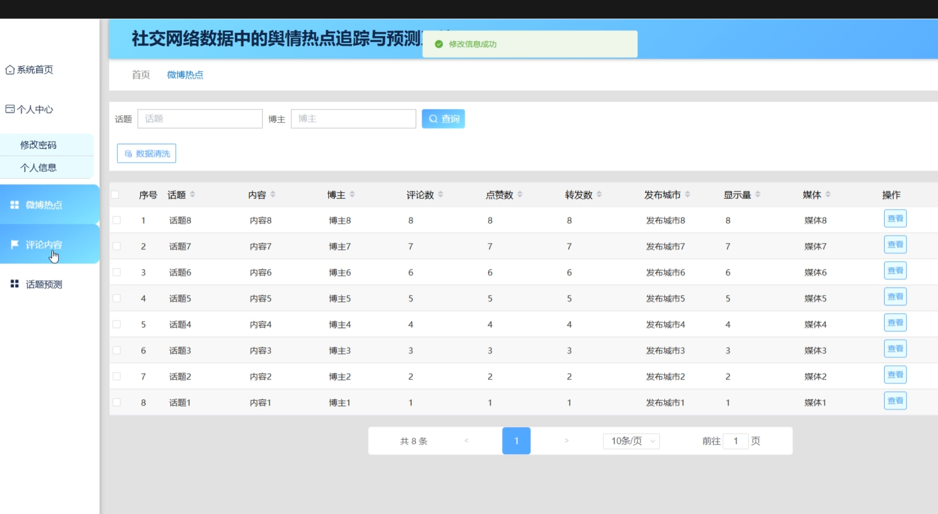 项目简介:基于社交网络数据中的舆情热点追踪与预测系统, 主要分为前台和后台,前台是用户,用户注册登录后进行个人社交网络数据中的舆情热点追踪和预测管理,管理员登录后进行系统管理,主要功能有:可视化大屏、用户管理、微博热点管理、评论内容管理、话题预测管理、个人信息、修改密码。