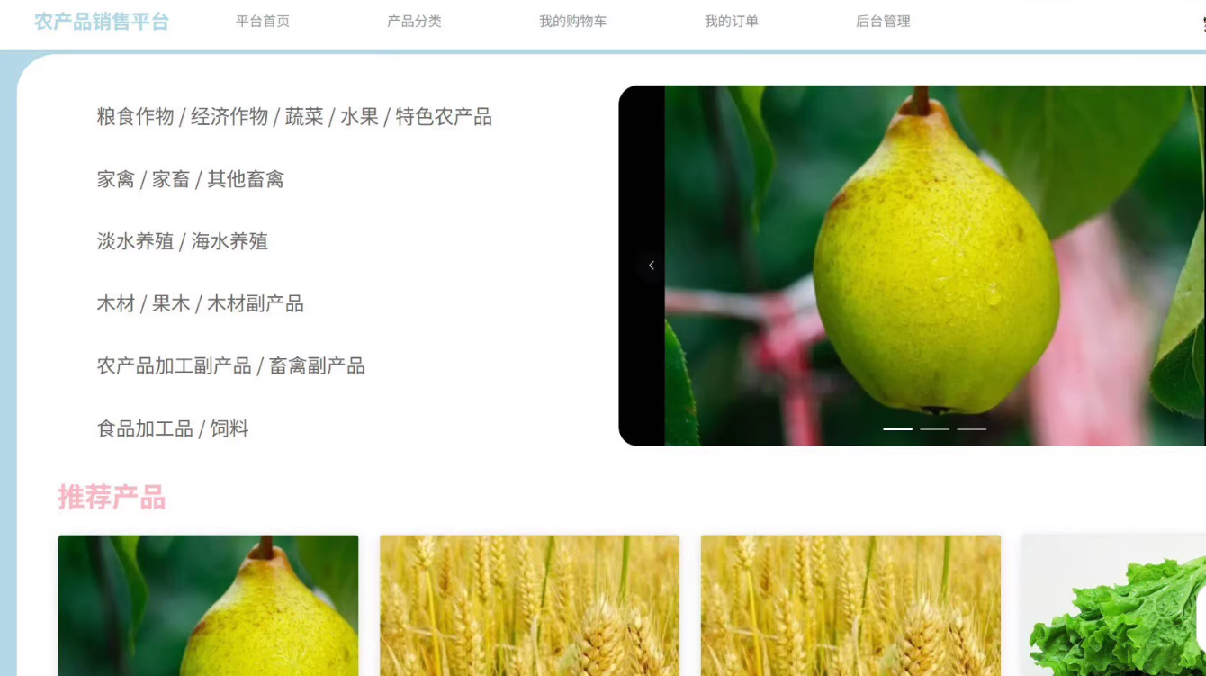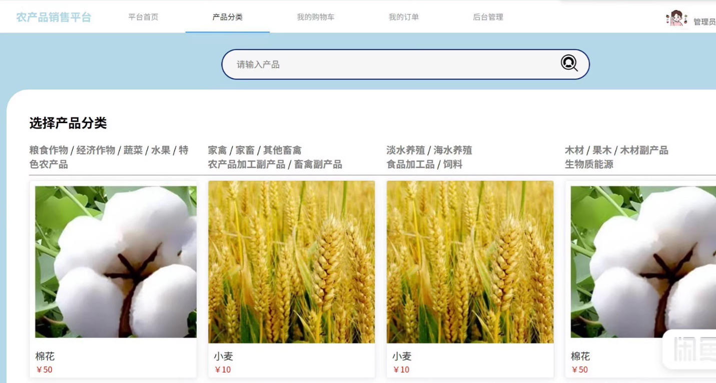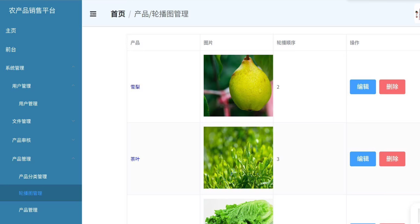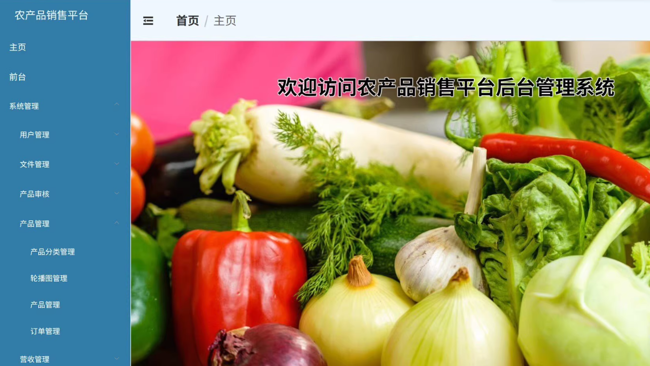 项目简介:基于SpringBoot的农产品销售系统, 主要分为前台和后台,前台是用户,用户登录后进行个人农产品管理,管理员登录后台进行系统管理,主要功能有;首页、用户管理、产品分类管理、产品管理、订单管理、轮播图管理、营收管理等。